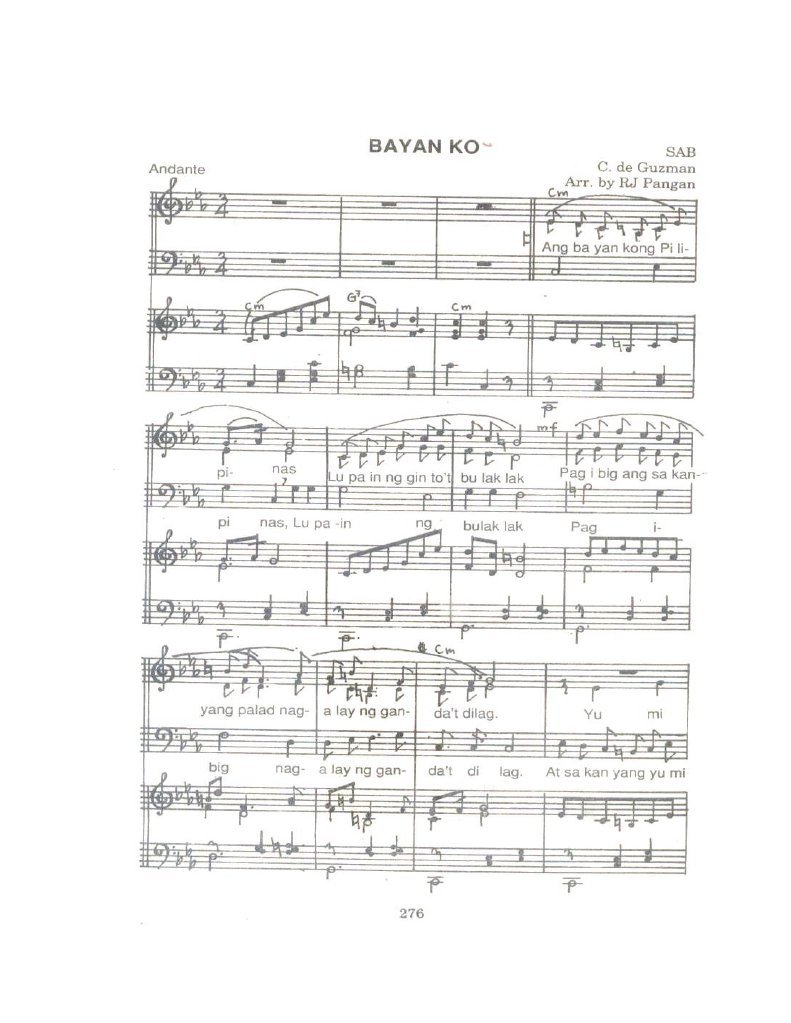 Bayan ko piano music sheet pdf from platinumfitnessandnutrition.com ★ myfreemp3 helps download your favourite mp3 songs download fast, and easy. At sa kanyang yumi at ganda dayuhan ay nahalina bayan ko, binihag ka nasadlak sa dusa. Bayan ko, originally titled nuestra patria in spanish (usually referred to in english as my country) is one of the most recognizable patriotic songs of the philippines. Original lyrics of bayan ko song by freddie aguilar. Long before it became an anthem to the edsa revolution and covered by folk singer freddie aguilar, it is a song that has spanned generations, imperial colonists, and even internal revolutions. 1,000+ song search results for bayan ko. It is a favorite song of the nationalistic filipino youth, progressive. Gayan bayan is a form of purvaranga as described in natyashastra of bharat muni.