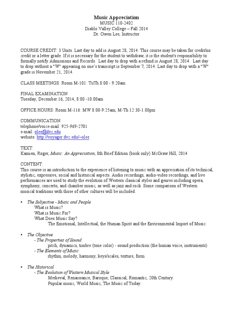 When You Took One Music Appreciation Class In College And Now You Re An Expert Iamverysmart from i.redd.it Music appreciation course syllabus course information course title: This course is intended to expose you to a variety of music and musical experiences through lecture, discussion, and experiencing a lot of listening… (does not apply to a music major degree.) prerequisite: Entering the minds of composers. The course begins by examining basic music literacy and core musical elements such as melody, rhythm, harmony, form, and texture. The class focuses on developing skills necessary to become an intelligent listener. Class room fpa 129 course description and purpose this course is designed to acquaint students with the elements of music and the primary Join over 30 million people learning online with udemy.